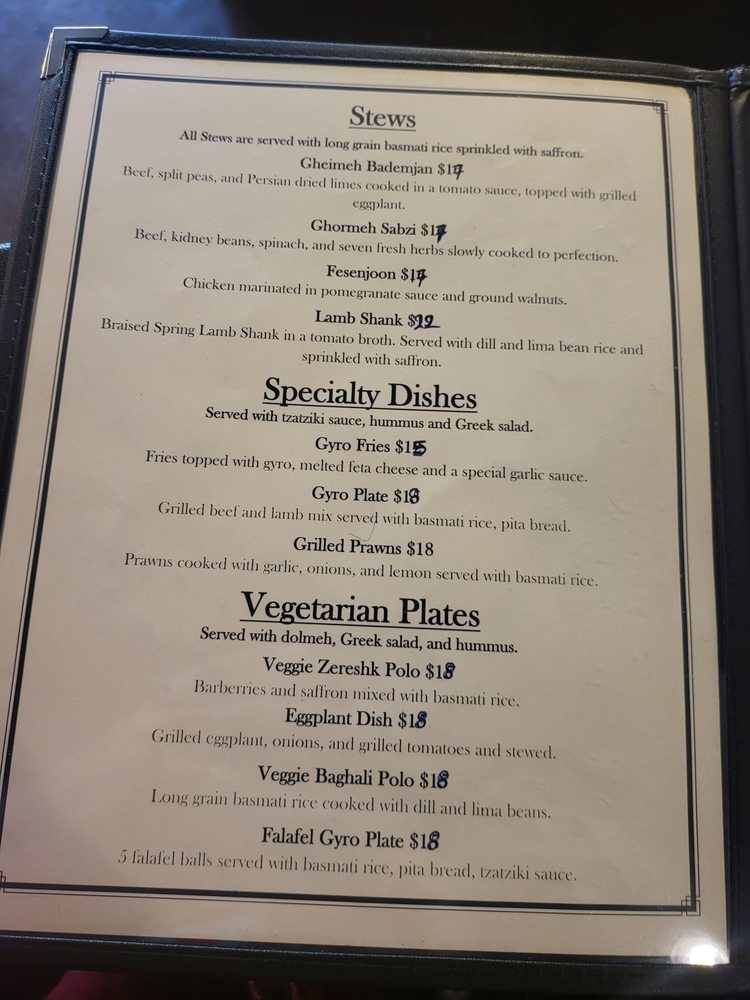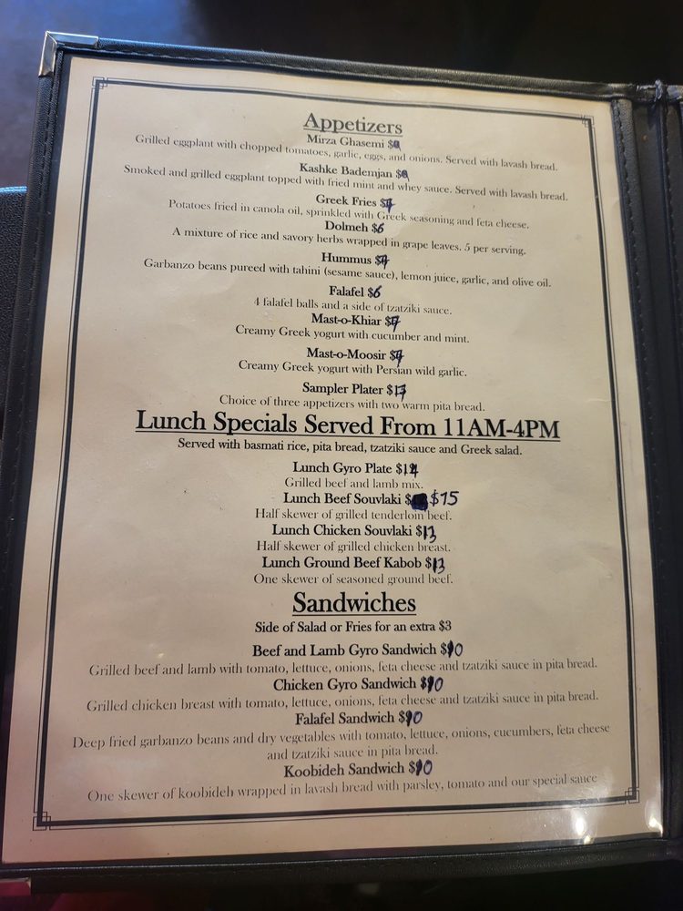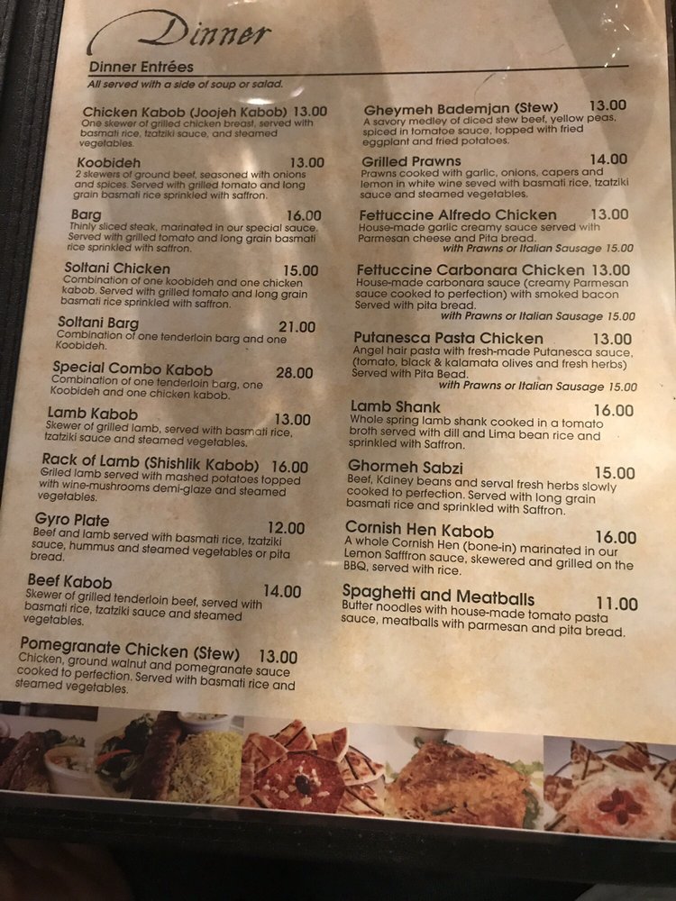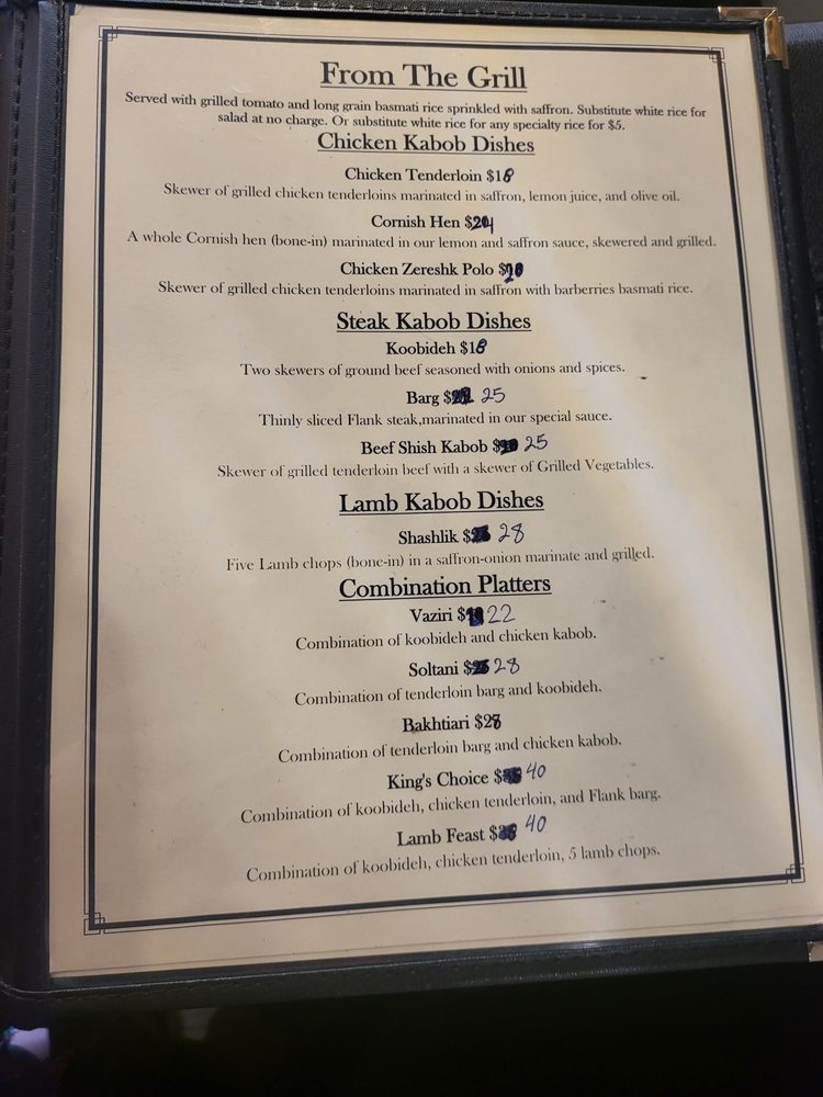 Combination of 1 tenderloin barg and 1 chicken kabob. Substitute side for an additional charge.